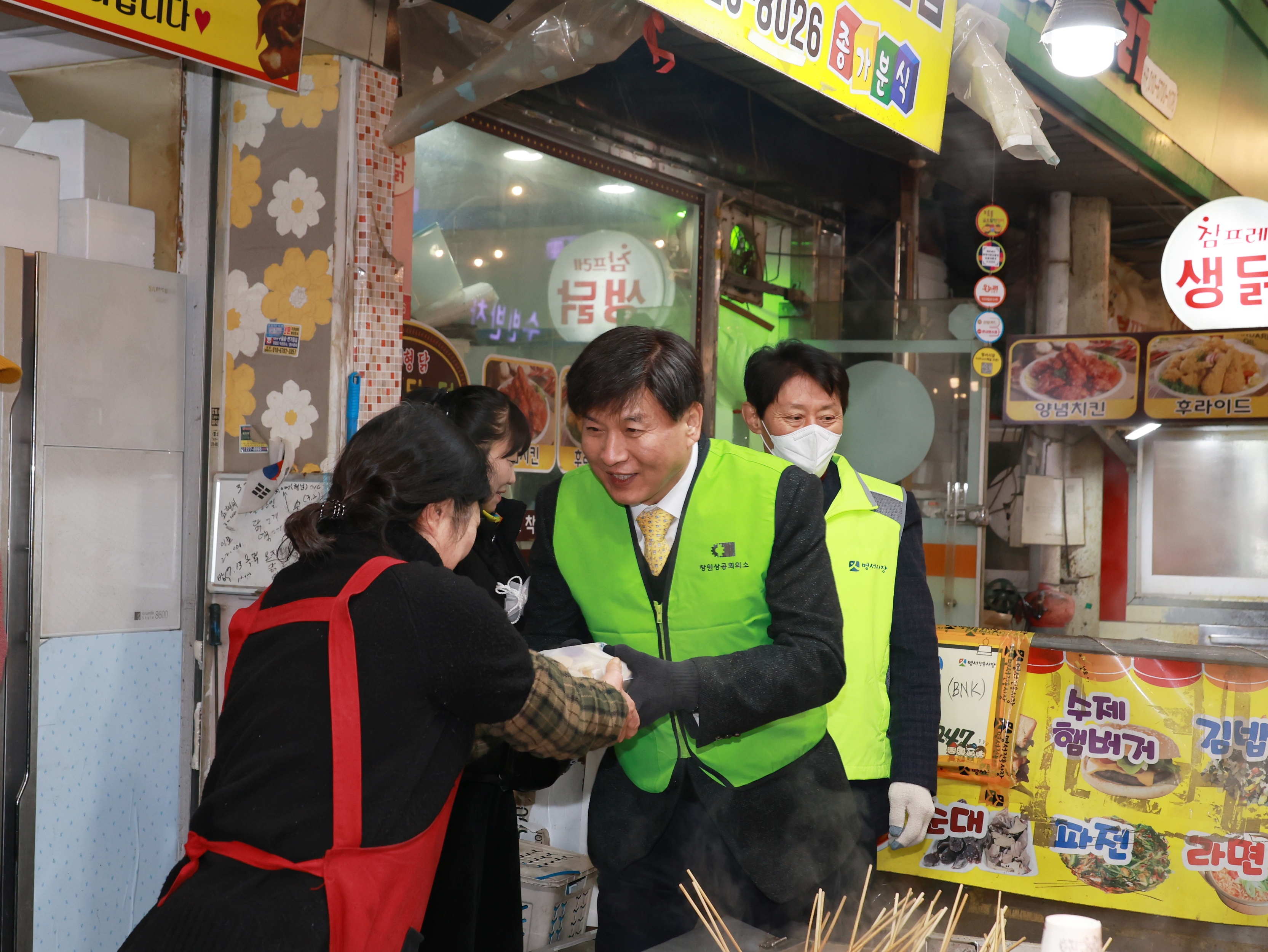 창원상공회의소(회장 최재호)는 연말을 맞아 지역 소상공인들에게 응원의 메시지를 전하고 지역 경제에 활력을 불어넣기 위해 12월 23일(화) 오후 4시 30분, 창원 의창구 명서전통시장에서 ‘으라차차 창원경제! 희망 떡 나누기’행사를 성황리에 개최했다고 밝혔다. |