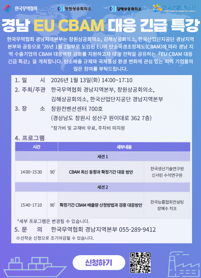 우리 상의 경남FTA통상진흥센터는 한국무역협회 경남지역본부, 김해상공회의소, 한국산업단지공단 경남지역본부와 공동으로 EU 탄소국경조정제도(CBAM) 본격 도입에 따라 경남 지역 수출기업의 대응역량 강화를 위하여 관련 제도를 설명하고 대응전략을 공유하는 『EU CBAM 대응 긴급 특강』을 다음과 같이 개최하오니 많은 신청 바랍니다.