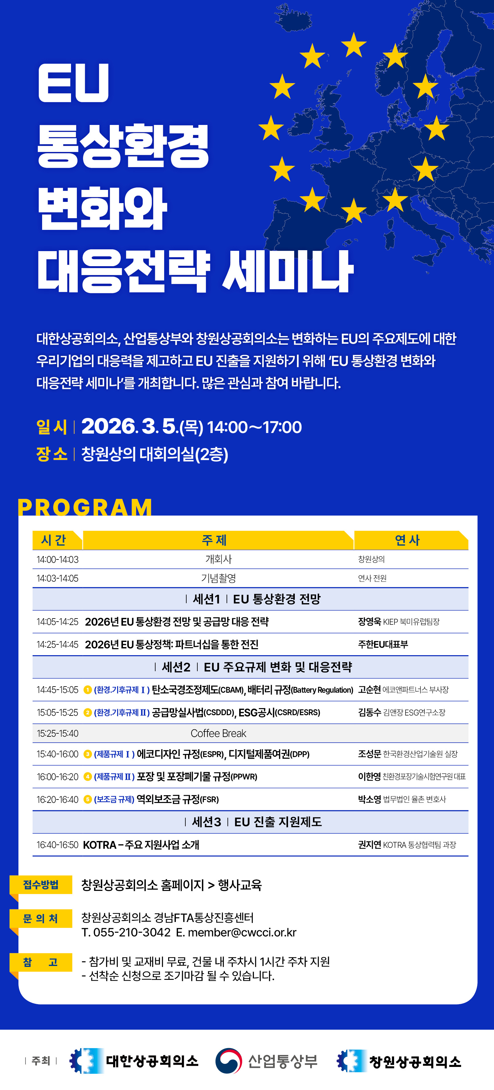 | 제목 | [3/5(목)] EU 통상환경 변화와 대응전략 세미나 개최 안내 | ||