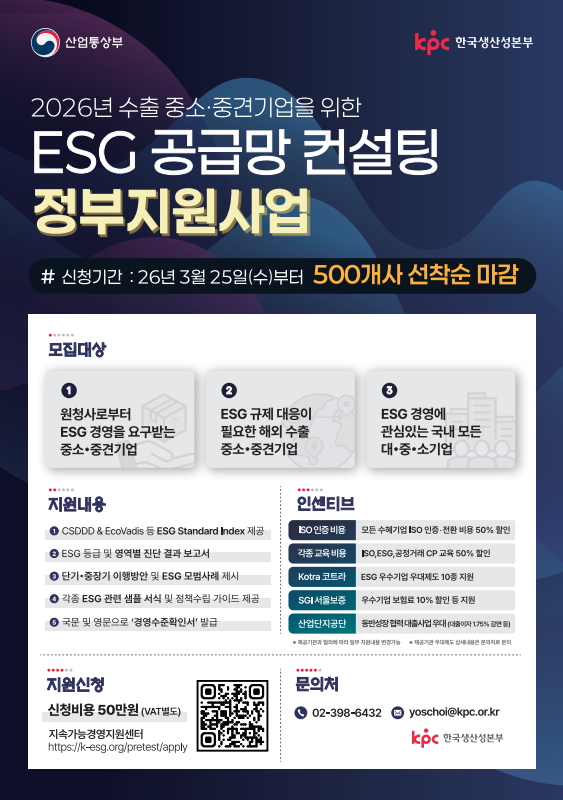 | ‒ | [경상남도] 2026년 수출 중소, 중견기업 ESG 공급망 컨설팅 지원사업(산업부) |