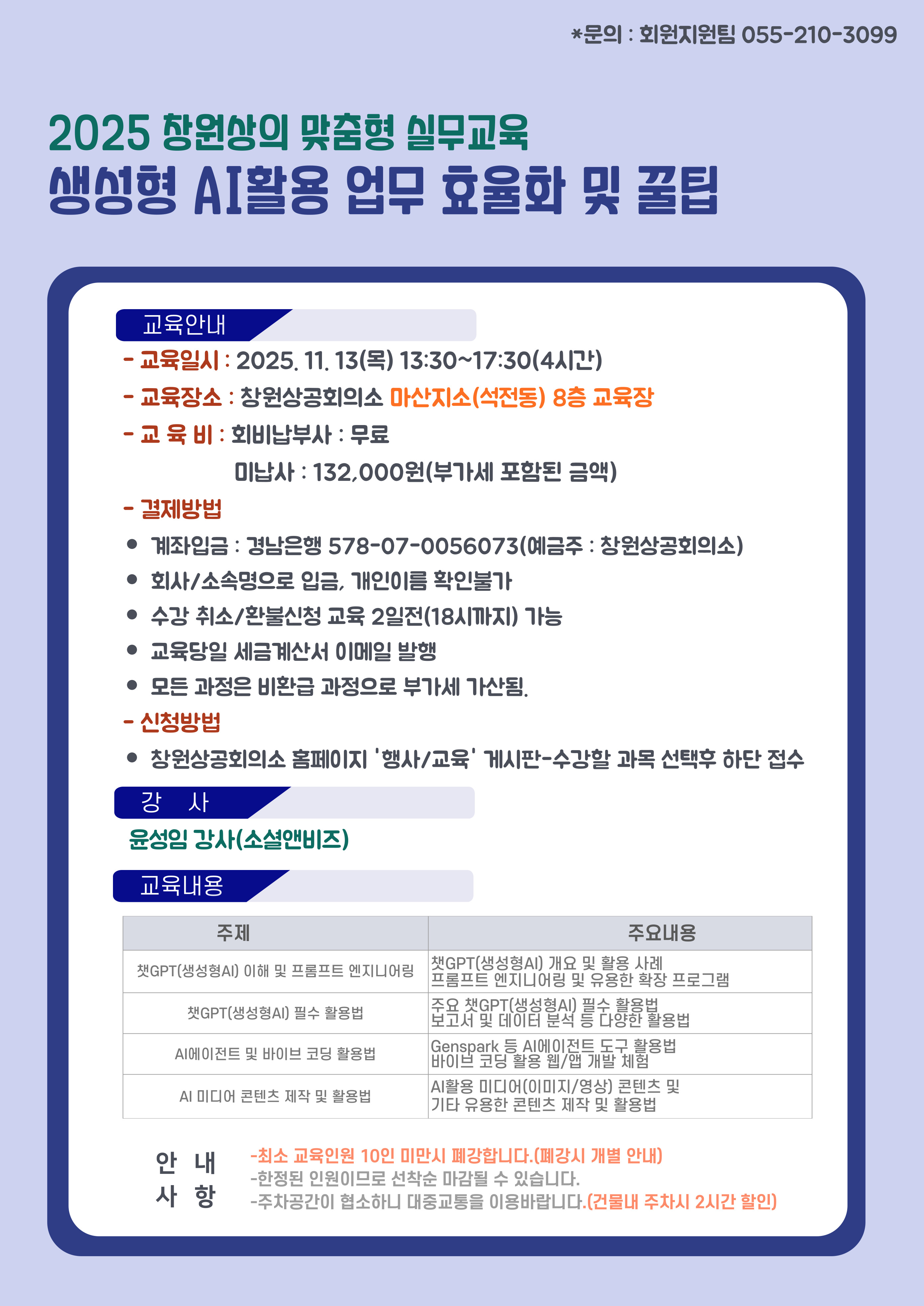 | ‒ | [11/13(목) 실무교육] 마산지소) 생성형AI 활용 업무 효율화 및 꿀팁 |