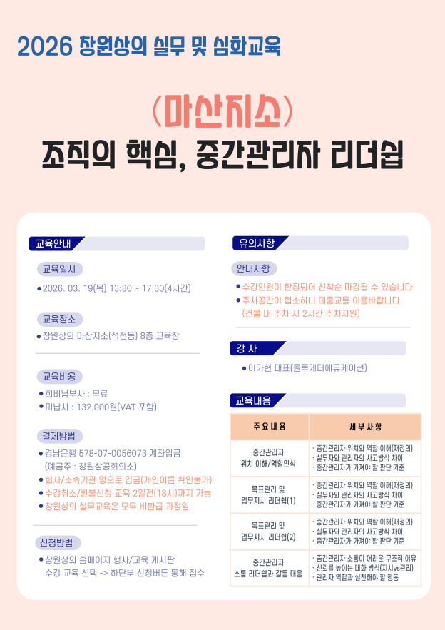| ‒ | [3/19(목) 실무교육] 마산지소) 조직의 핵심, 중간관리자 리더쉽 |