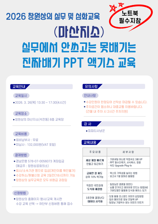 | ‒ | [3/26(목) 실무교육] 마산지소) 실무에서 안쓰고는 못배기는 진짜배기 PPT 액기스 |